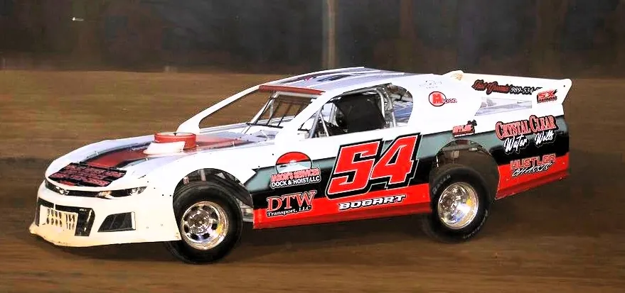 The household name in stock car racing is NASCAR, the sanctioning body behind the Daytona 500 and other paved-oval races. Andrew races on dirt tracks — packed clay, specifically — and the skill set is its own discipline entirely. The suspension sits higher and carries more attitude in the corners. Weight transfers dramatically. The rear swings wide. And the track evolves throughout the night as each race lays down rubber, moves clay, and changes the grip.